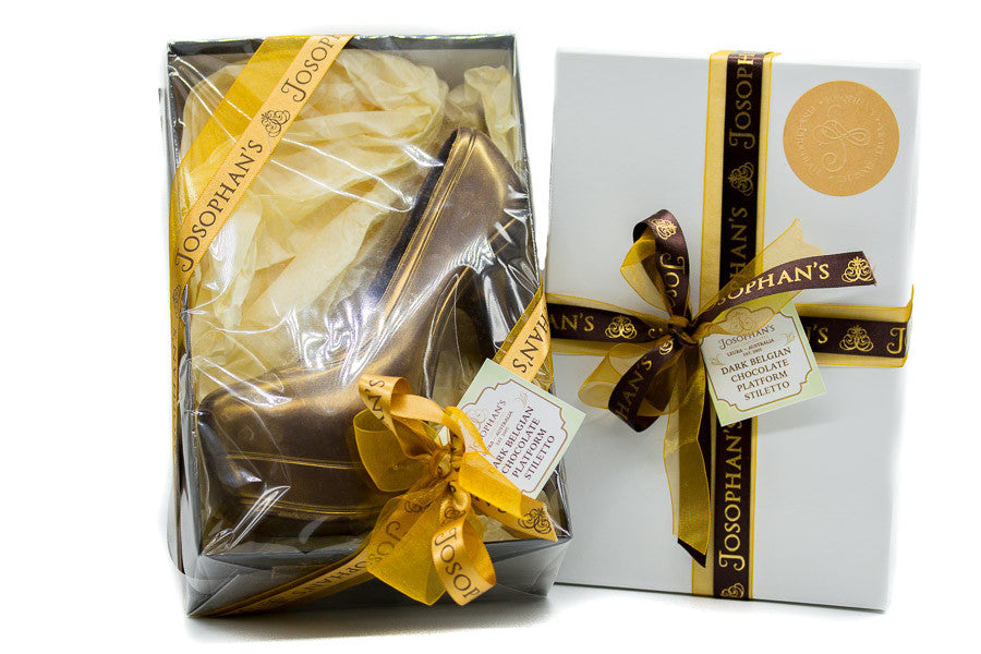 Handcrafted dark Fair-trade Belgian couverture chocolate platform stiletto heel with golden shimmer finish.