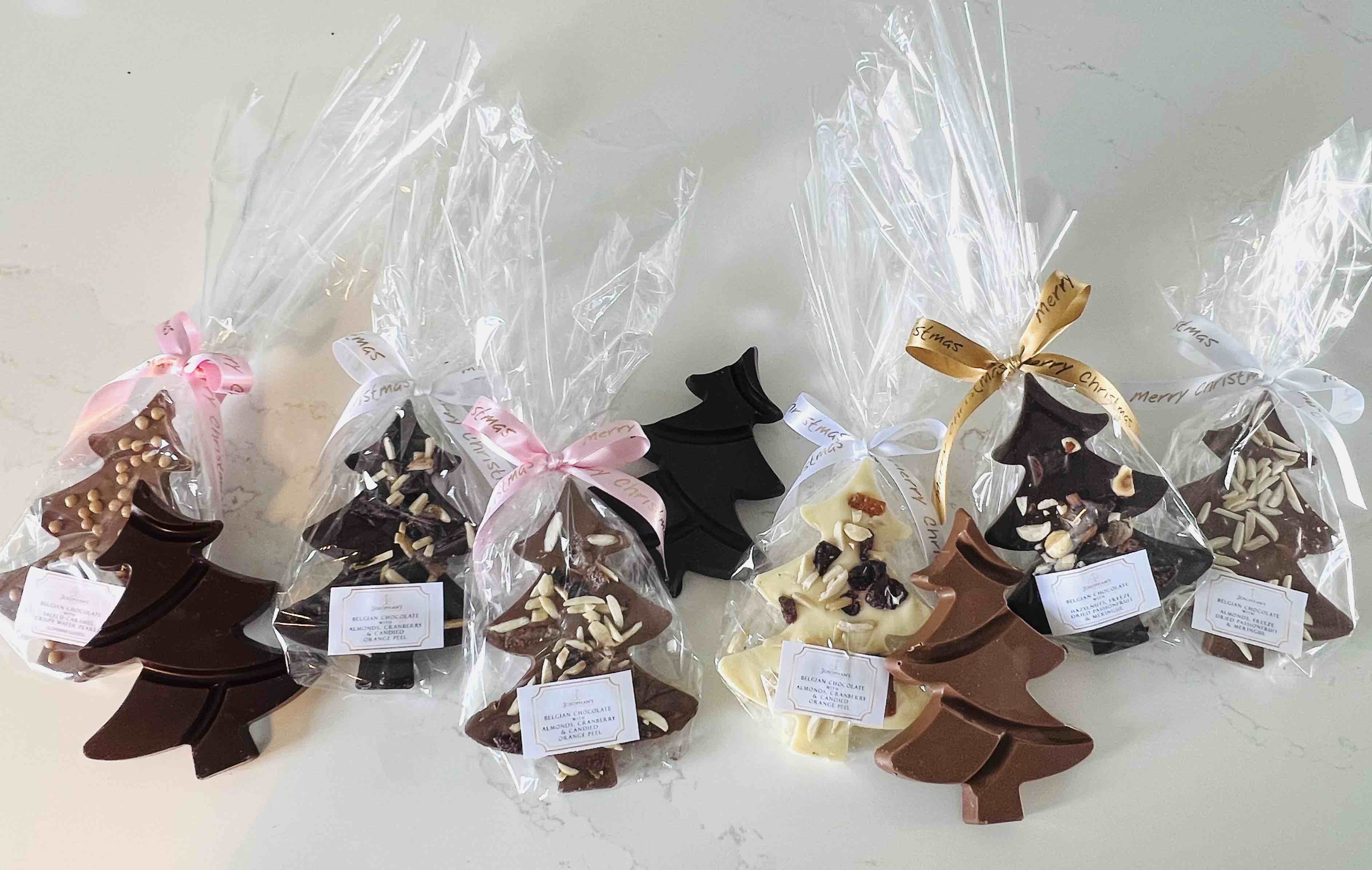 Handcrafted Christmas tree in solid milk, white, or dark Fair Trade Belgian chocolate, topped with toasted almonds, dried cranberry and candied orange peel. Gift wrapped in cellophane with satin 'Merry Christmas' ribbon. A fantastic stocking filler, and small gift.